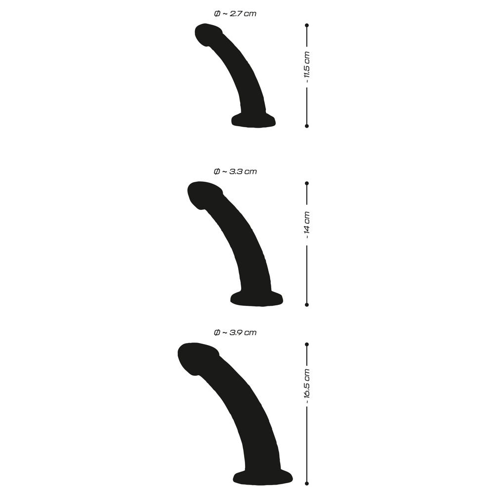 Dildo trio for anal pleasure and stretching training.3-piece anal dildo set with different sizes and weights,Small dildo, total length 11.5 cm, insertion length 10.3 cm,��diameter��2.7 cm, weight 59 g.Dildo medium total length 14 cm, insertion length 12.6 cm,��diameter 3.3 cm, weight 104 g.Dildo large total length 16.5 cm, insertion length 15 cm, diameter 3.9 cm, weight 154 g.Each transparent dildo is ideally curved and extremely flexible with pronounced glans and a strong suction cup.