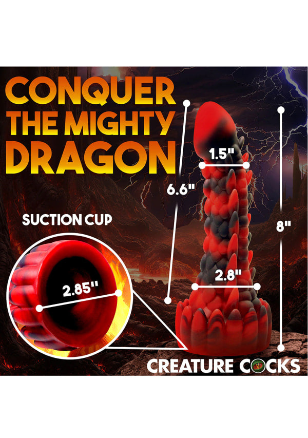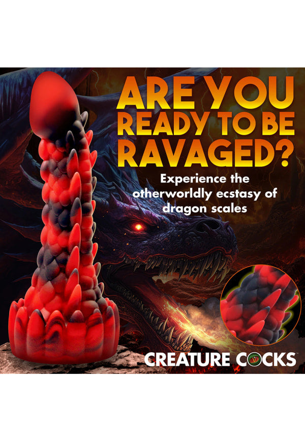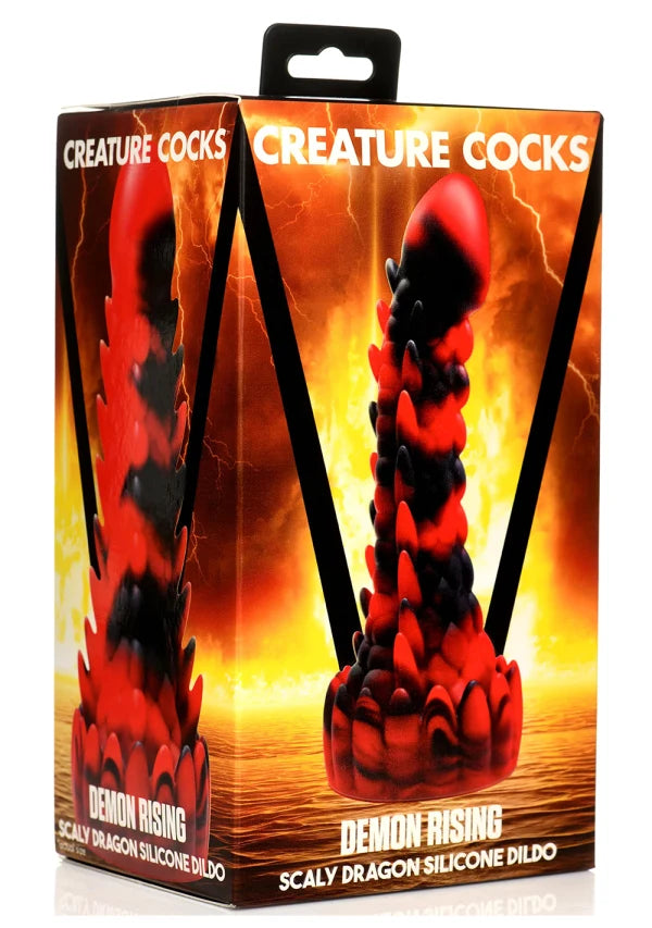 Some dragons keep their private mysteries secret, but this scaly dragon has just bared it all! This red and black dong is part demon and part dragon. Long and lean, it has a smooth, round head at the top, a lean and scaly shaft, and a round base. At the base is a row of upward pointed spikes and along the shaft are four different textured lines. One is a row of round bumps. The other three are more round-nubbed spikes. Youll be overloaded with intense sensation riding this stimulating rod! Made out of premium, flexible, phthalate-free silicone, this dong is body-safe and best used with water-based lubricants only. Enjoy hands-free rides due to the strong suction cup base! Invite a partner to indulge in kinky cosplay or fantasy roleplay and use their favourite harness to transform this dong into a strap-on! Afterwards, make sure to wash it with warm water and mild soap, then spray it with a toy cleaner and air-dry. Keep out of direct sunlight and heat.