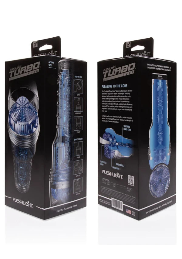 PLEASURE TO THE CORE! The Fleshlight Turbo Core offers multiple layers of inner stimulation explicitly designed to replicate the earth-shaking sensations of oral sex. Uniquely designed with our patented multiple suspended entry points, each layer will grab hold of you with various textured sensations. As you slide inside, the Turbo Cores external suspended tips caress you, rubbing its nibs gently across your head and shaft with each and every stroke. With your member fully engulfed, the matching pair of floating inner rings work in unison to achieve a snug yet welcoming grip. Finally, as you drill deeper into its core, prepare yourself for a toe-curling combo of gripping texture and exceptional suction, unlike anything you have felt before.