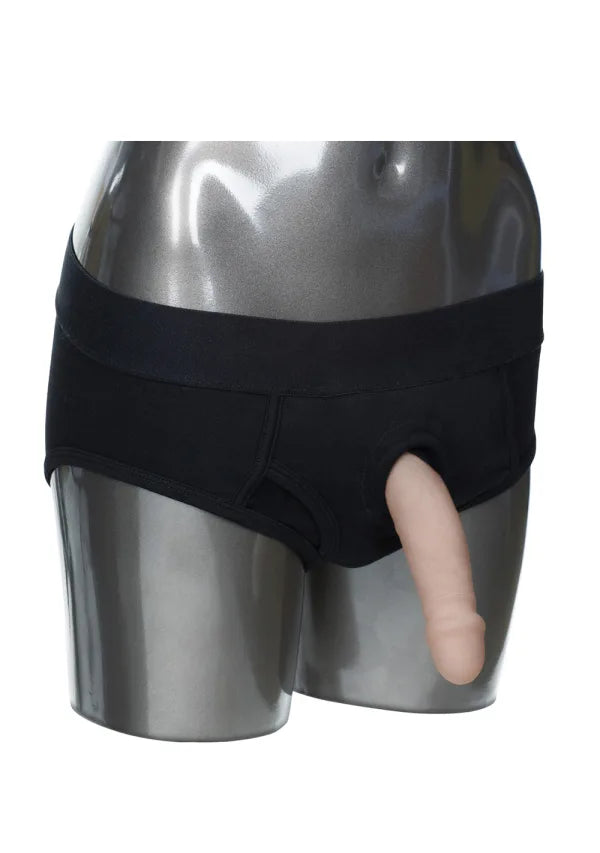 Black brief harness, add your own dong or stimulator Discreet 2 panel design to accommodate dual penetration Reinforced O ring stretches to accommodate most packers, dongs or probes Soft, stretchy and comfortable Comfortable soft lining Internal strap to secure your packer in place, packer not included Internal pockets to add a favourite stimulator, not included Washable 95 percent Cotton, 5 percent SpandexFor women.