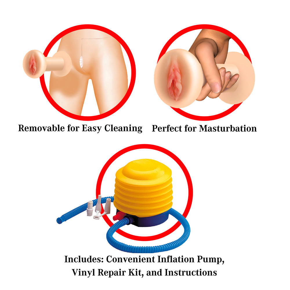 Wanna see what's hiding under this pretty pink bikini? How bout a pair of perfectly round breasts, perky hard nipples, and a pussy and ass so soft they're just begging for you to come inside! Take me for a test drive and feel what it's like to experience a real British sex machine. I'm all yours to explore and do as you like. Every inch of ME!xoxo HannahThis incredible life-size inflatable love doll was meticulously designed with realistic features for a truly lifelike experience. Her sexy 3-D formed head features realistic eyelashes and a luxurious head of real hair that's begging to be pulled! Watch her really come to life with arms that swivel 360 degrees and delightfully painted finger and toenails. Give her firm and perky breasts a squeeze while you enjoy her ultra-lifelike Fanta-Flesh skin, pussy, and an ass that feels even better than the real thing! The Fanta-Flesh pussy and ass are removable for easy in-depth cleaning, and can even be enjoyed separately for masturbation. An inflation pump, vinyl repair kit, and instructions are conveniently included.How to InflateDO NOT OVER INFLATE. To avoid over-inflation, do not use an electric compressor. Instead, use the included manual pump to blow the doll up to 90 percent capacity. Let it rest for ten minutes so the air can evenly distribute within the doll before inflating completely. The less air inside the doll, the less strain will be placed on it during use.Cleaning Instructions.To clean the Fanta Flesh piece, remove it and clean separately from the doll. Rinse the Fanta Flesh in warm water, then scrub with toy cleaner both internally and externally using your hands or a soft cloth. Rinse with warm water, then pat dry with a lint-free cloth. Sprinkle internally and externally with Fanta Flesh Revive powder to dry excess moisture and help maintain the material's softness.To clean the doll, rinse with warm water, then gently scrub with toy cleaner using your hands or a soft cloth. Avoid using rough cloths or sponges, as this could damage the material. After scrubbing, rinse again with warm water. Pat dry with a lint-free towel.Storage Instructions:Deflate the doll, then carefully fold it before loosely wrapping it in a lint-free cloth. Store in a cool, dry place away from direct sunlight, like a trunk or closet.Other Care Instructions:Avoid sharp objects. Repair punctures promptly using the included repair kit and instruction sheet. Ensure the puncture is clean and dry for an airtight seal. Avoid lubes and lotions in the hair to avoid damage and tangling.
